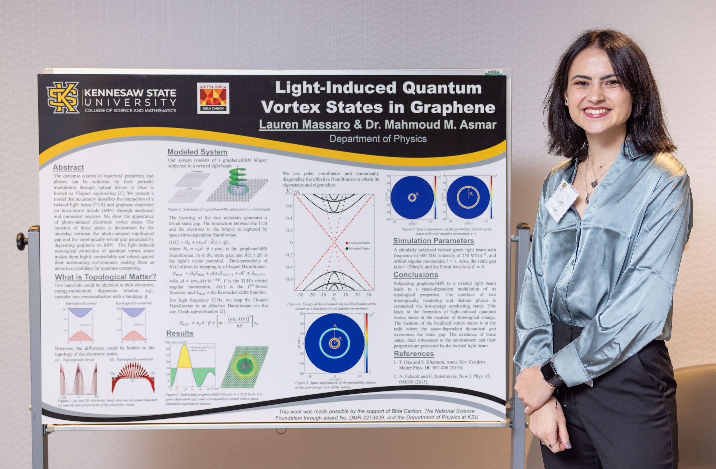 - Lauren presented a poster titled "Floquet-Induced Electronic Vortex States in Dirac-like Materials" at the Birla Carbon Symposium at Kennesaw State University. Her presentation highlighted how structured light can drive vortex-like states in 2D quantum materials, offering new ways to control quantum phases. Read more about the symposium and Lauren’s presentation here.